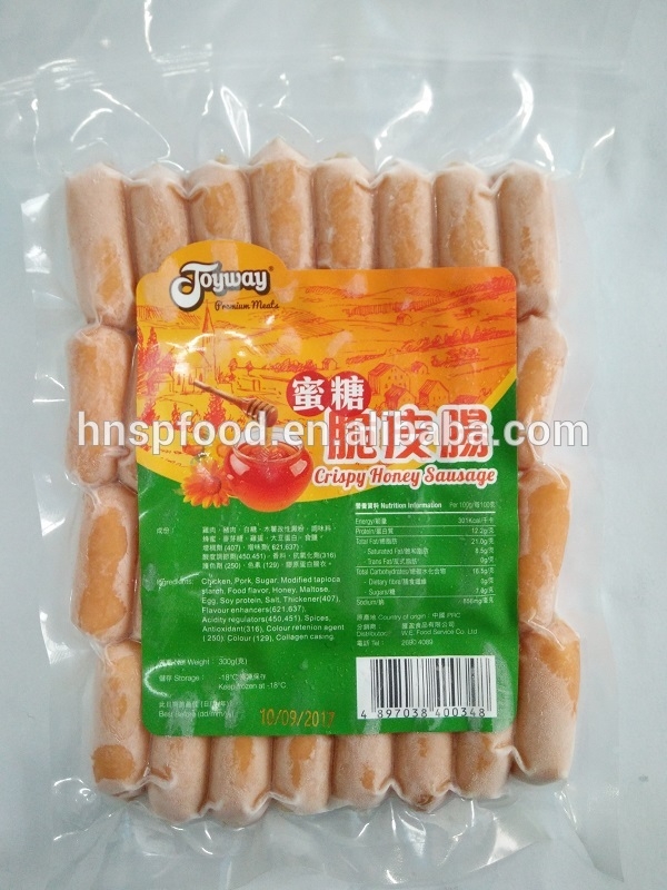 Ingredients: Chicken ,Pork ,sugar ,modified tapioca starch ,food flavor ,honey,Maltose,Egg,Soyprotein,salt,Thickener,flavour enhancer,acidity regulators ,Spices ,Antionxidant ,colour retenion agent (250) colour (129),Collaggen casing