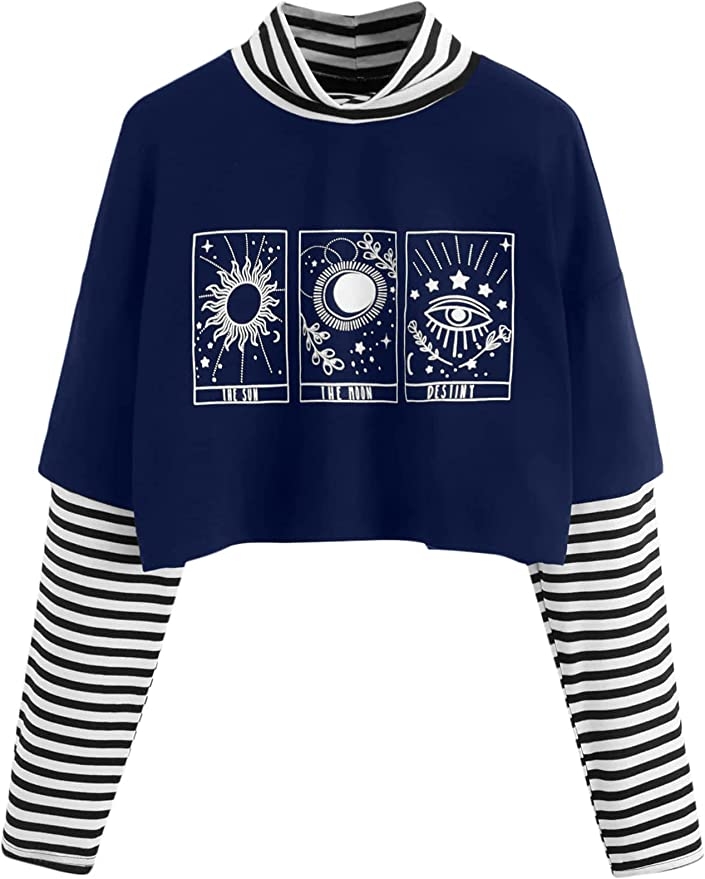女士拼色蝴蝶印花条纹长袖露脐上衣 T 恤 蓝色 M$90.00