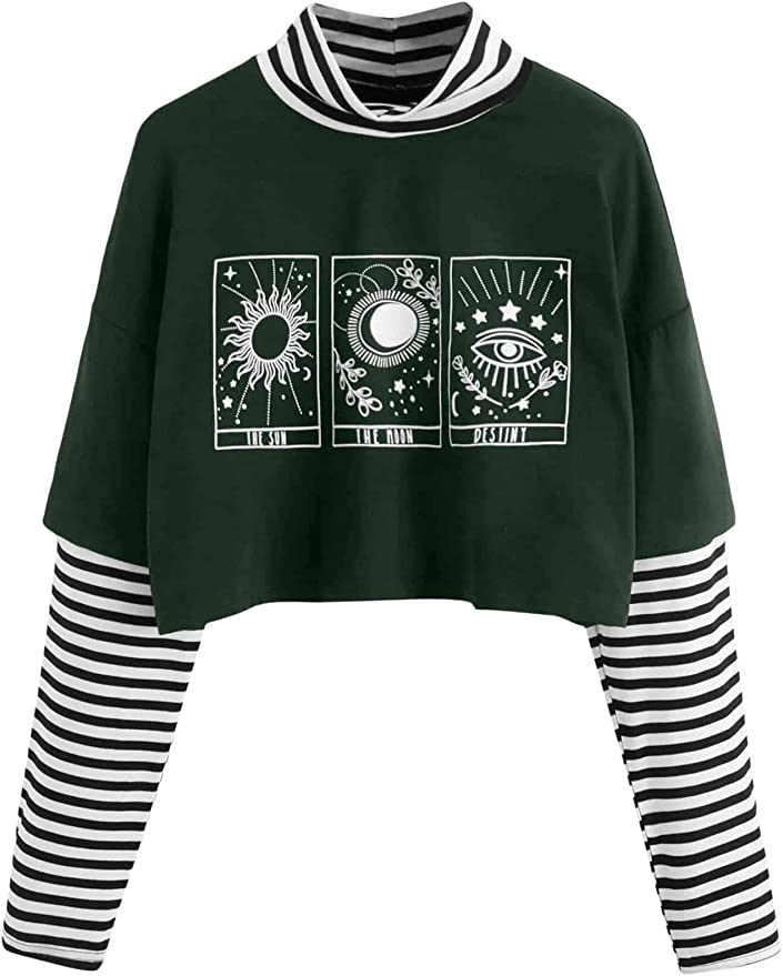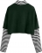女士拼色蝴蝶印花条纹长袖露脐上衣 T 恤 深绿色 s$90.00