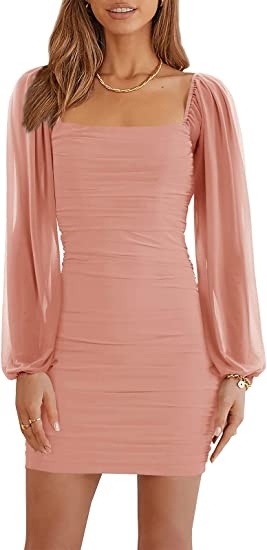 女式网眼长袖方领褶饰派对俱乐部鸡尾酒会紧身迷你连衣裙 粉色 XL