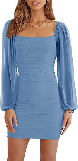 女式网眼长袖方领褶饰派对俱乐部鸡尾酒会紧身迷你连衣裙 蓝色 XL