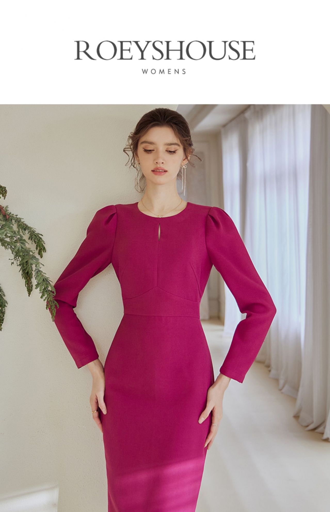 Hooye知性纯色肌理感连衣裙2022秋装新款泡泡袖修身包臀裙子