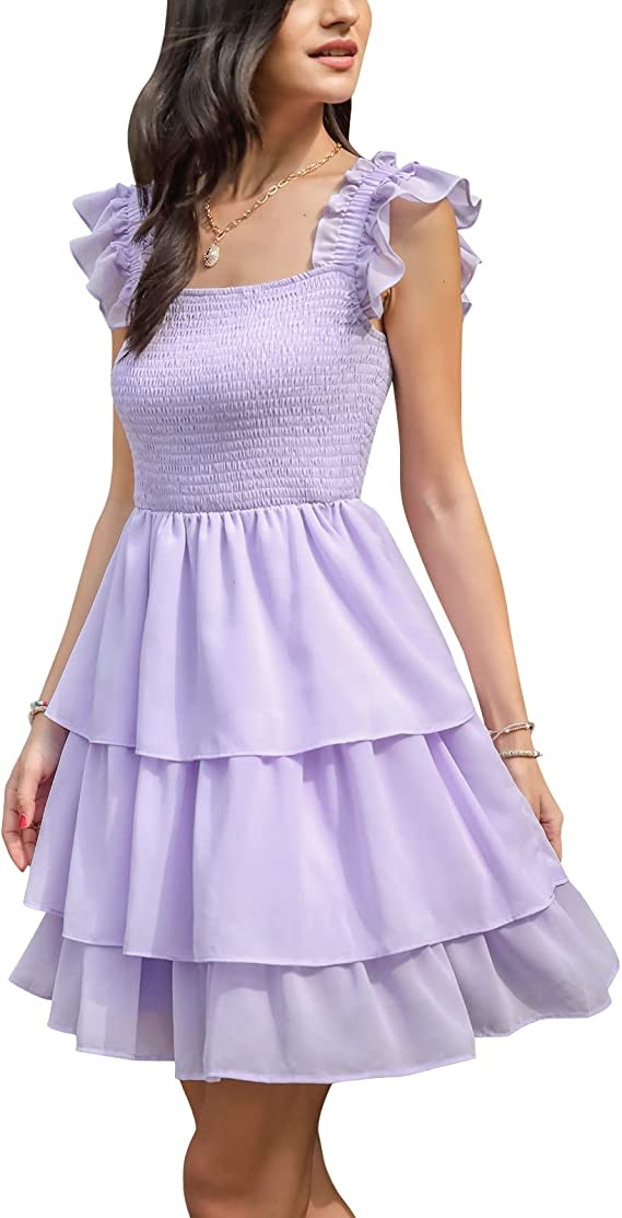 EXLURA Womens Square Neck Sleeveless Ruffle Dress