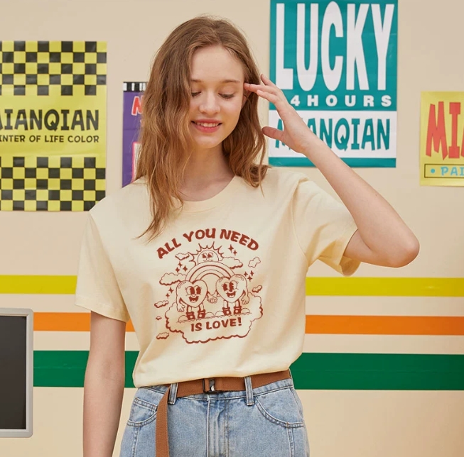 时尚复古做旧打底衫浪漫玫瑰印花短袖T恤 咖色 s$69.00
