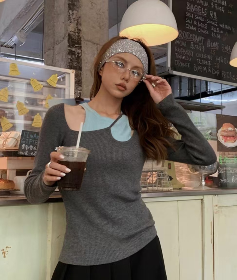 安哥拉红撞色小众设计假两件针织衫毛衣 紫色 s$120.00