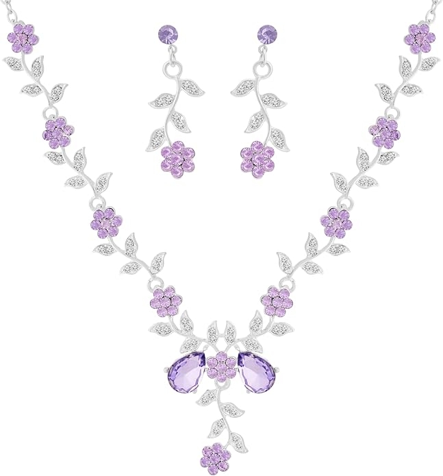 Sacina 紫色伴娘首饰套装,花叶水钻项链和耳环套装,婚礼首饰,紫色项链,女士紫色首饰套装,复古项