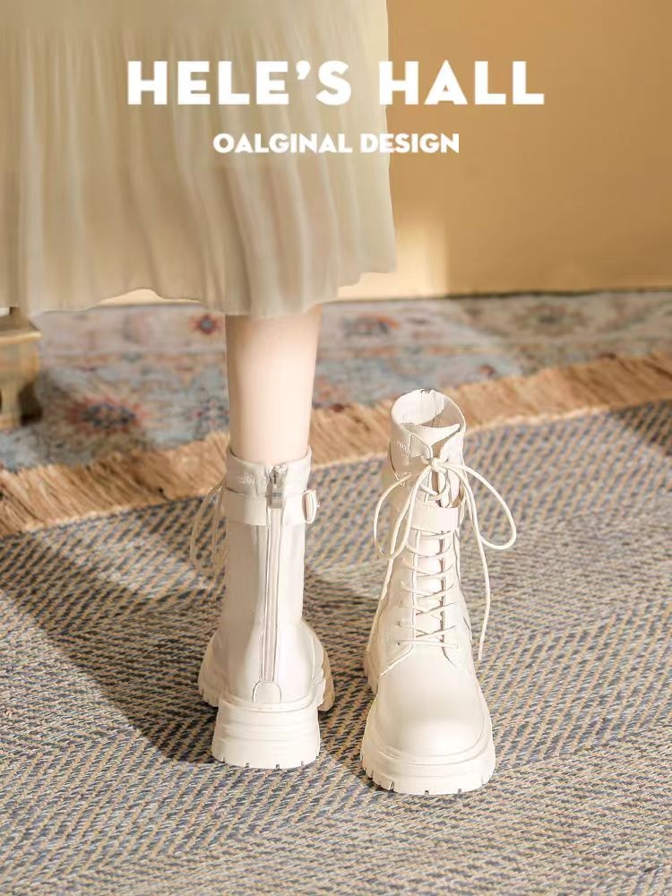 海伦馆白色马丁靴女秋冬新款真皮厚底短靴女靴中筒靴冬季加绒靴子
